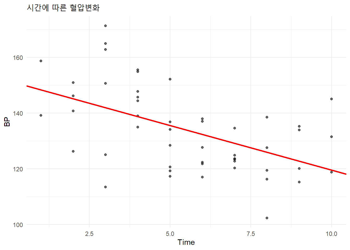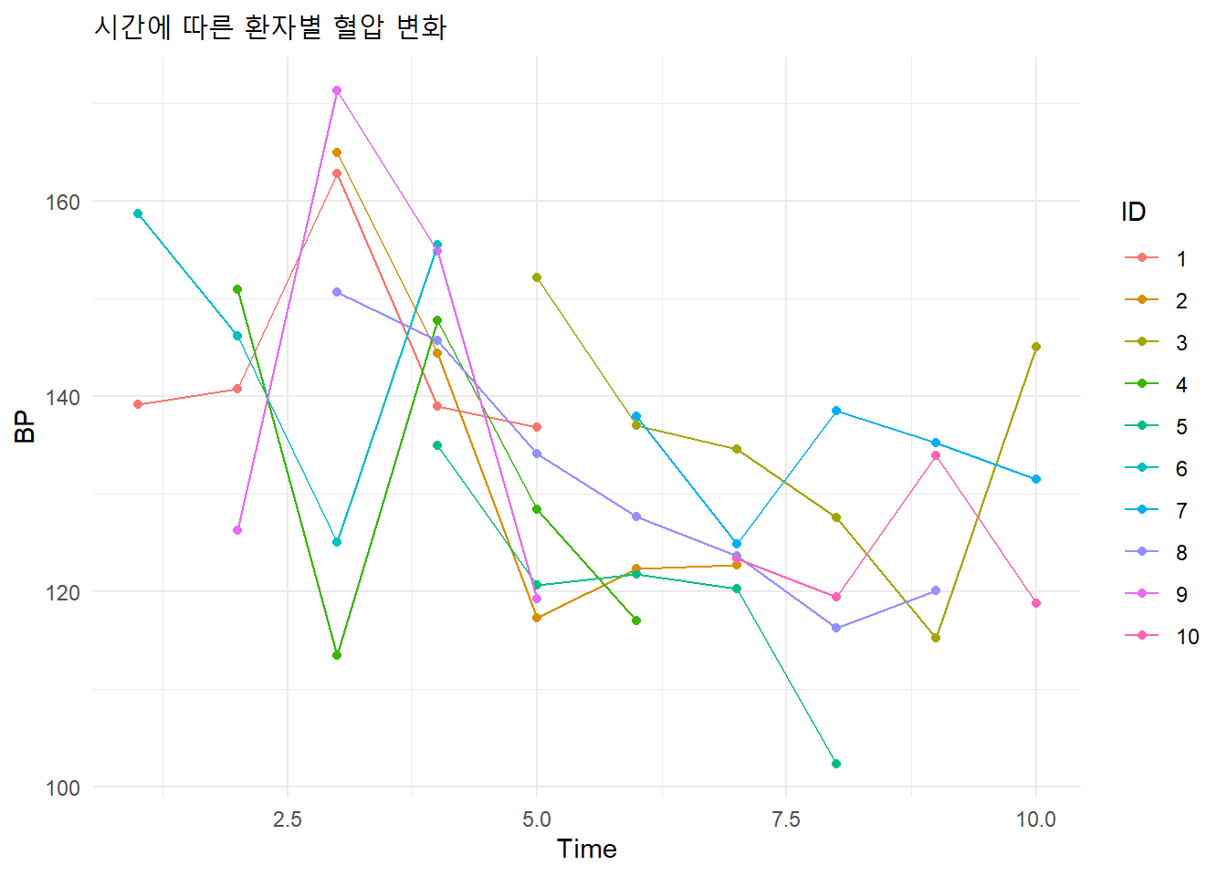 시간에 따른 혈압의 변화를 살펴보았을 떄, 같은 환자에게 반복측정되었다는 사실을 반영하지 않고 데이터를 바라보았을 때는 시간이 지날수록 혈압이 감소한다는 결론을 얻을 수 있습니다. 하지만 환자별로 살펴본다면 실제로는 제 각각의 환자들에 대해서는 시간과 유의미한 관계가 있다고 보기는 힘들다는 것을 알 수 있습니다. 이는 전체 분석을 할 때 군집 데이터의 특성을 GLM은 반영하지 않기 때문임을 알 수 있습니다. 반복측정된 데이터들간에는 상관관계가 있다는 사실을 반영한 새로운 측정방식이 필요하다는 것을 알 수 있습니다. 이러한 상관관계를 반영한 모델은 다음과 같이 쓸 수 있습니다: