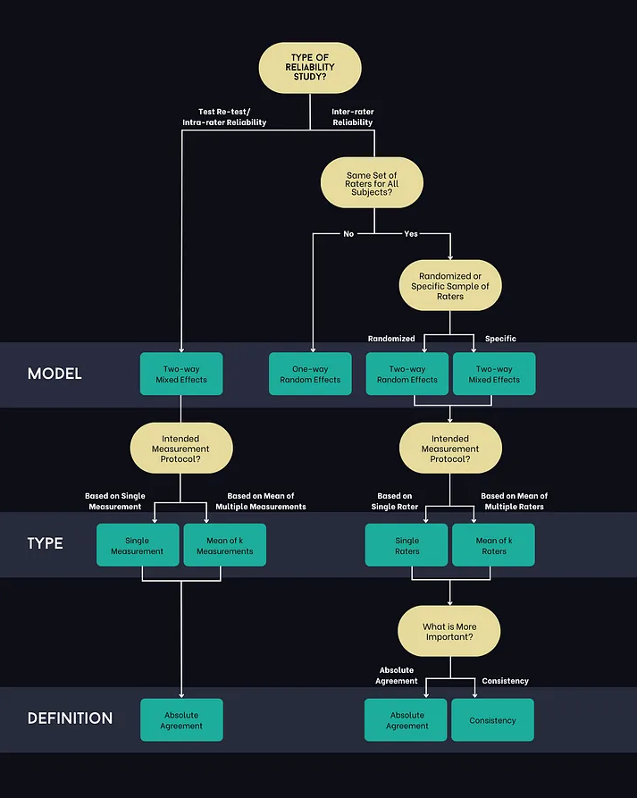 즉, ICC는 총 변동성 중에서 집단 내 일관성에 기인하는 부분의 비율을 나타내는 것이고, Cohen’s Kappa는 실제 일치가 단순히 우연에 의한 것이 아님을 보장해 주는 것이다.